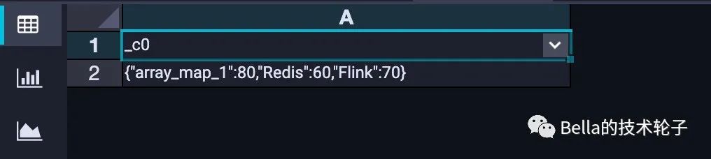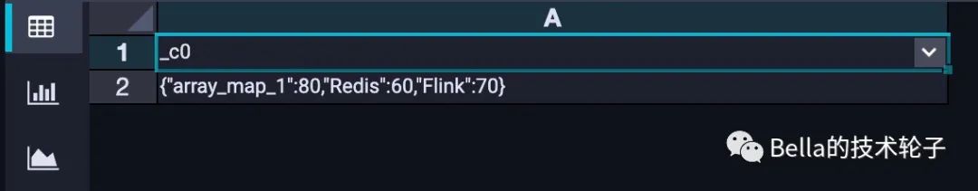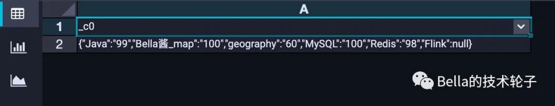 SELECT to_json(map('Bella酱_map',100,'MySQL',100,'Java',99,'Redis',98,'geography',60, 'Flink', CAST(NULL AS STRING )));