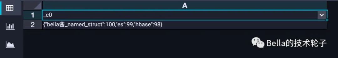 SELECT to_json(NAMED_STRUCT('Bella酱_named_struct', 100, 'ES', 99, 'HBase', 98, 'Java', CAST(null AS STRING)));