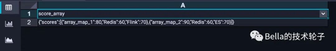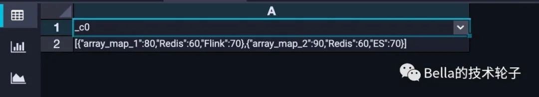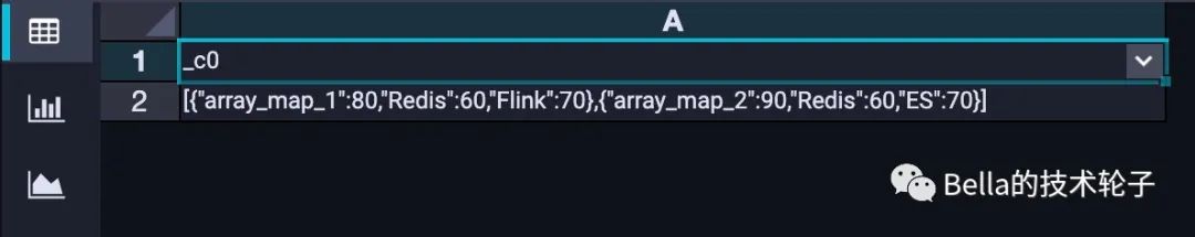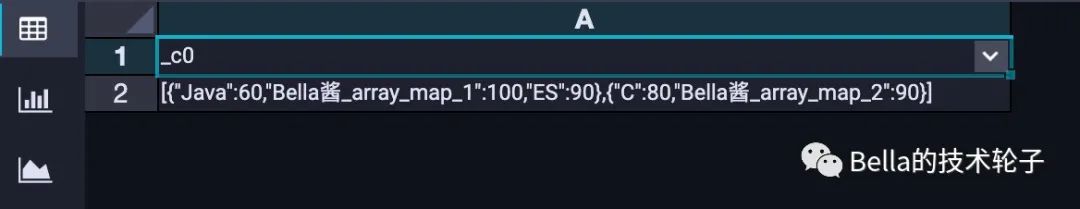 SELECT to_json(ARRAY(map('Bella酱_array_map_1', 100, 'ES', 90, 'Java', 60), map('Bella酱_array_map_2', 90, 'C', 80)));