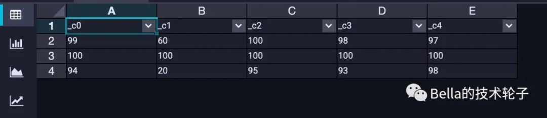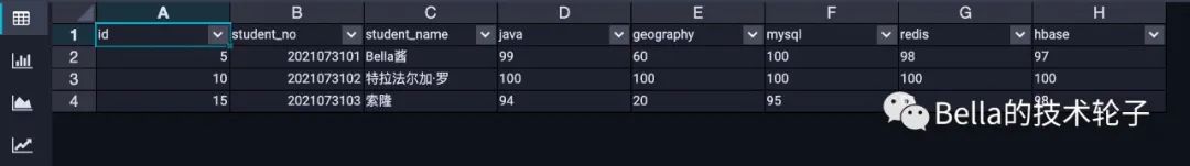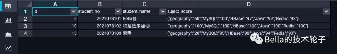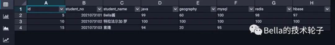 (4, 2021073101, 'Bella酱', 'HBase', 97),