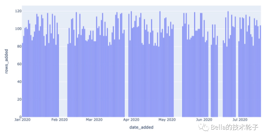 要做DQC,我们首先需要保证数据的新鲜程度。它能告诉我们数据上次更新的时间。假如有一个小时报,它的数据看起来和上个小时的一模一样,那我们就要去排查哪儿发生了什么问题了。在我们的模拟数据中,我们用date_added这一列表明每颗星球的发现时间。所以我们能看到每天发现的星球数量: