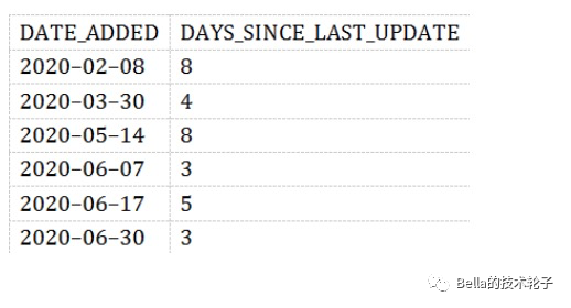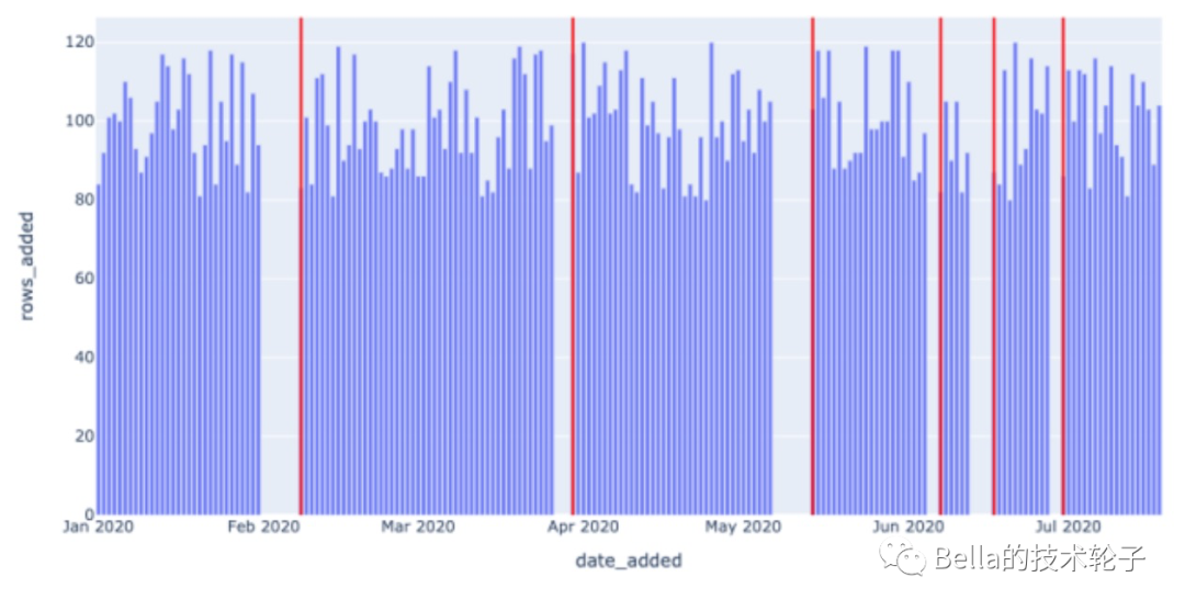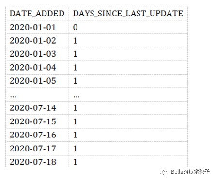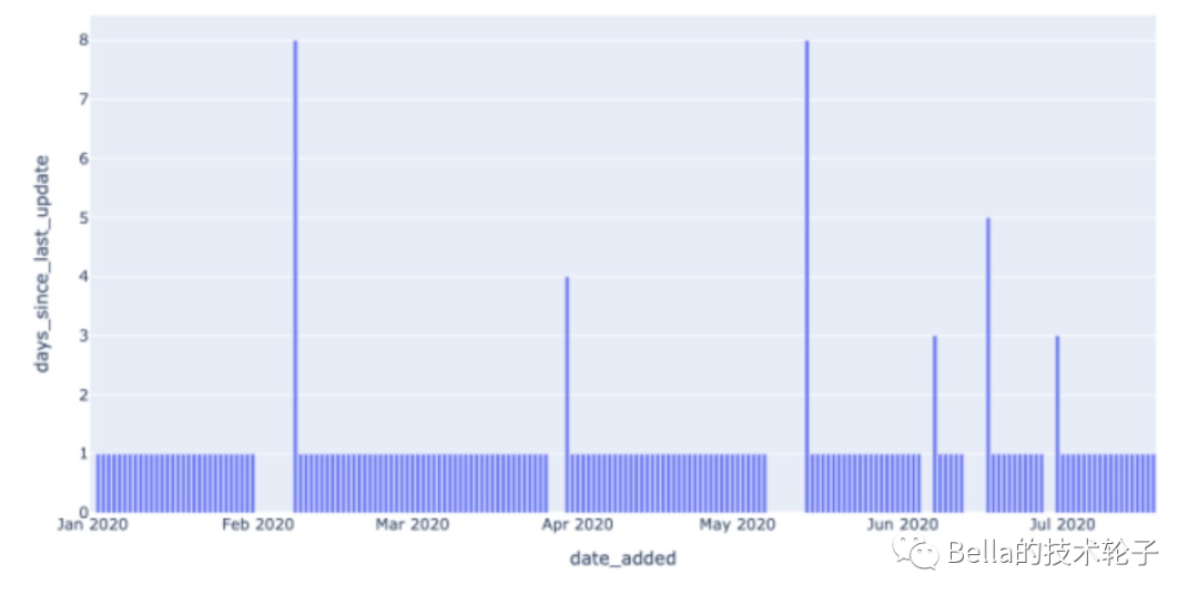 我们可以通过引入一个新的度量值-DAYS_SINCE_LAST_UPDATE。它表示date_added之间的gap。如果数据没有问题,这个值应该每天都是1。当大于1时,说明数据间隔超过了一天。那很明显数据是有问题的。