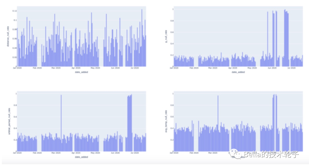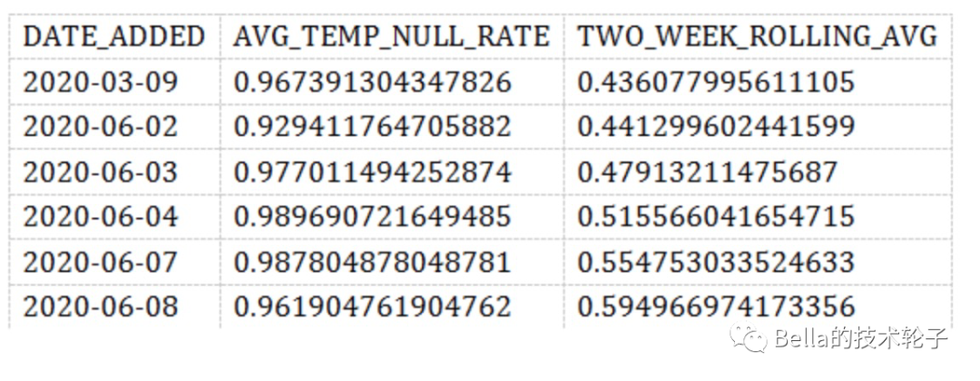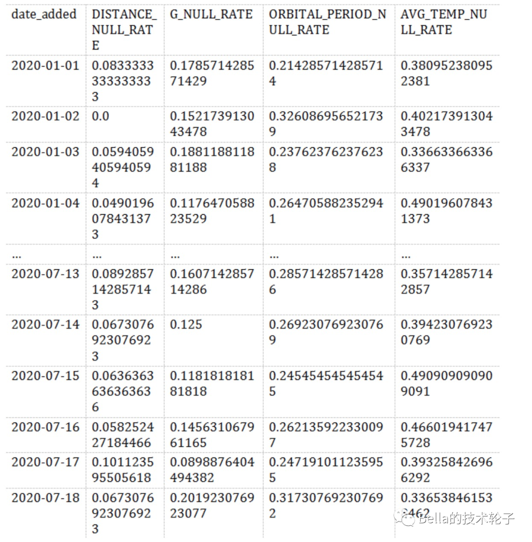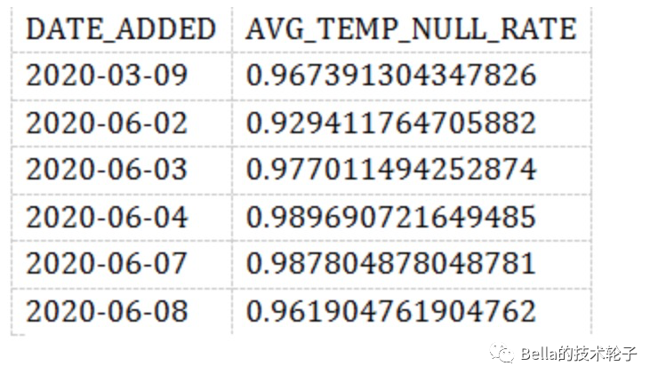 通用公式 CAST (SUM (CASE WHEN SOME _ metric IS NULL THEN 1 ELSE 0 END) AS FLOAT)/COUNT (*) ,按 DATE_ADDED 列分组,我们能看到NULL值得分布情况。