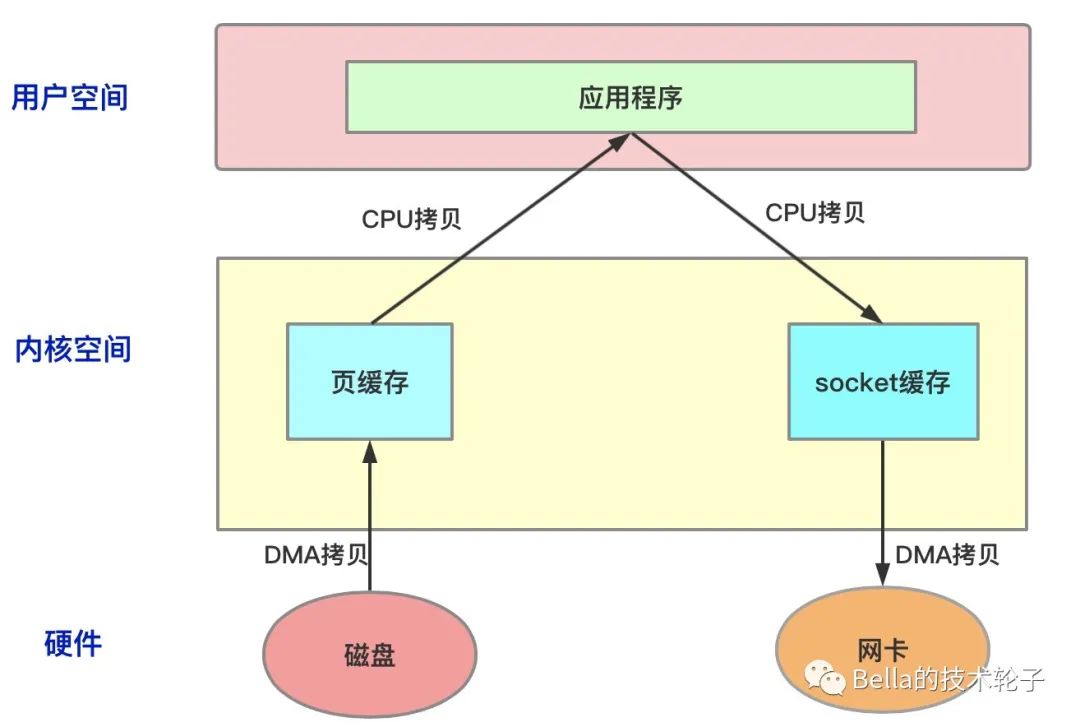 整个流程从内核空间和硬件之间数据拷贝是DMA复制传输,内核空间和用户空间之间数据拷贝是通过CPU复制.另外CPU除了需要参与拷贝任务,还需要多次从内核空间和用户空间之间来回切换,无疑都额外增加了很多的CPU工作负担。