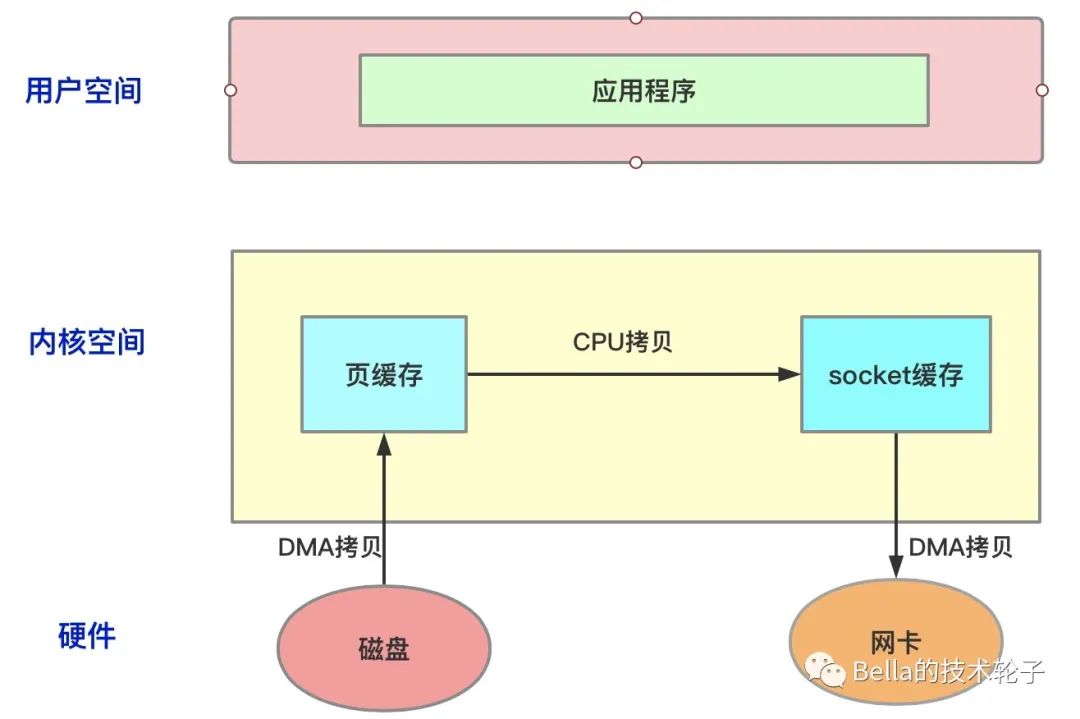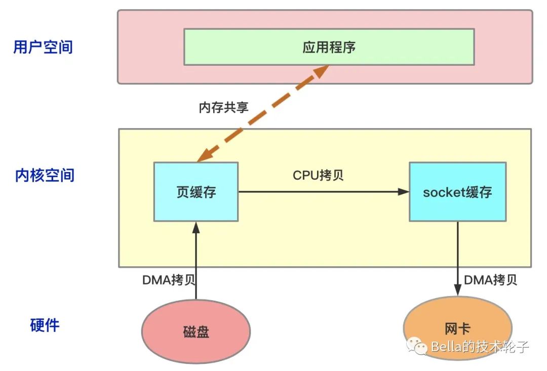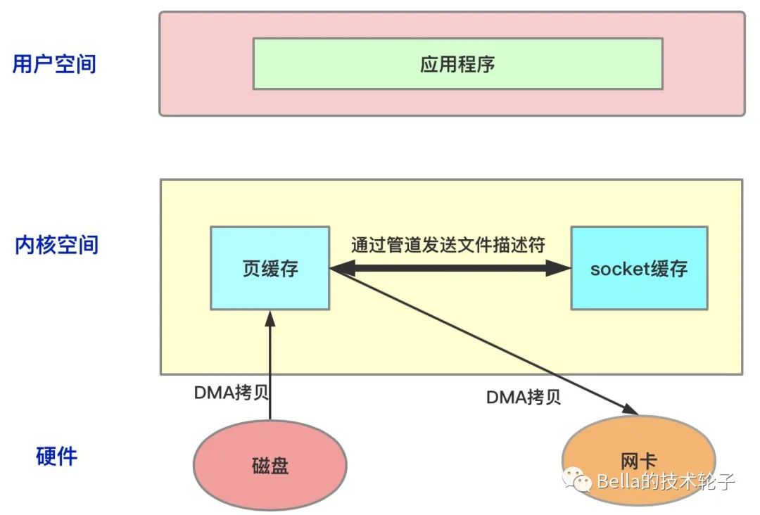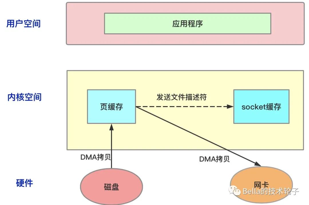 整个过程中:DMA拷贝2次、CPU拷贝0次、内核空间和用户空间切换0次