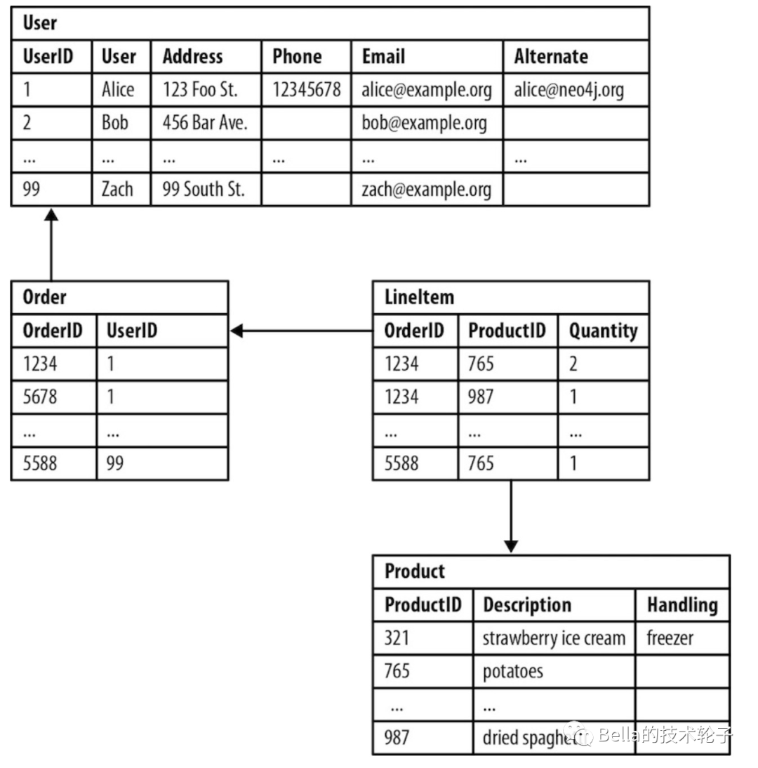 举个栗子:假设某关系型数据库中有这么几张用户、订单、商品表: