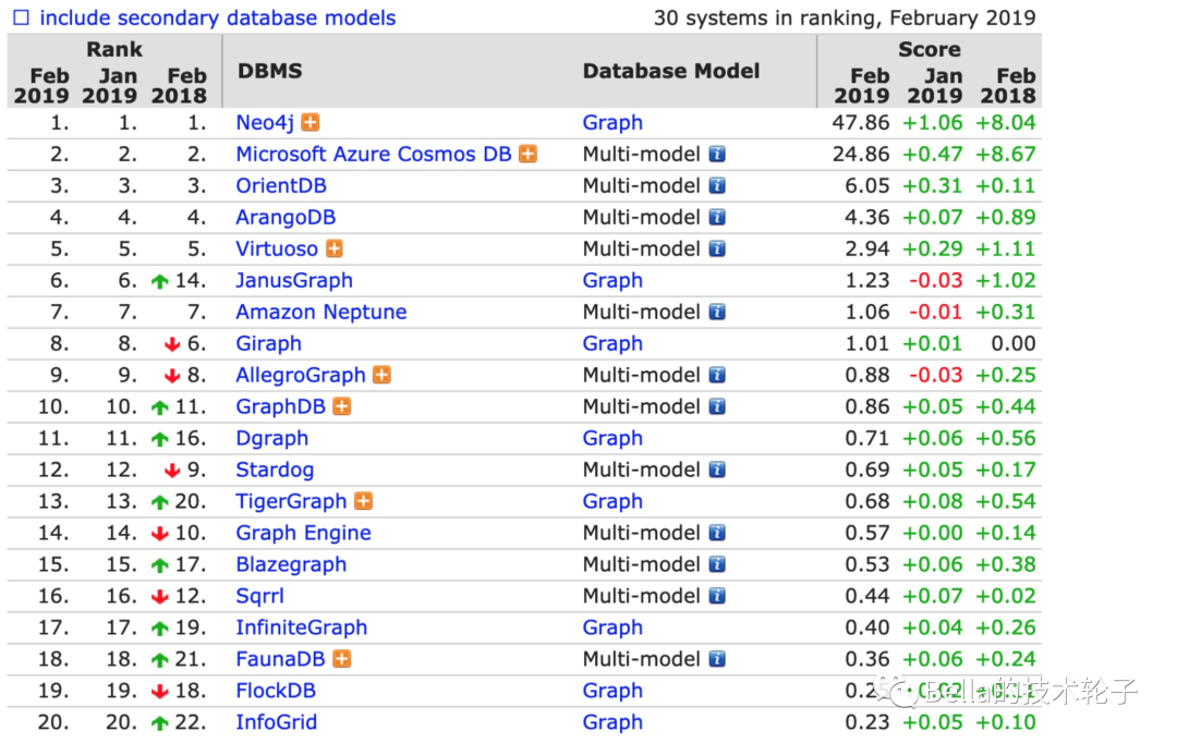 根据DB-Engines最新发布的图数据库排名,Neo4J仍然大幅领先排在第一位: