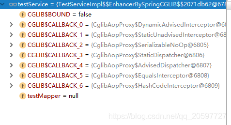 所以,如果所有方法上的修饰符都是非public的时候,那么将不会创建代理对象。以一开始的测试代码为例,如果正常的修饰符的testService是下面图片中的,经过cglib创建的代理对象。
