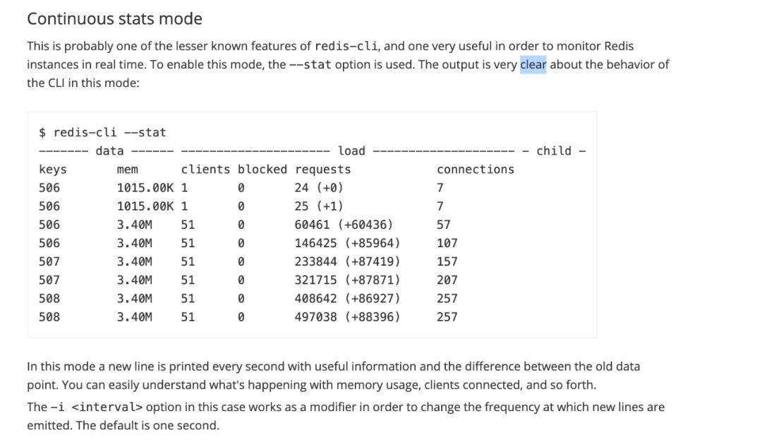 关于stat选项,官网也是介绍的比较简单。使用redis-cli命令加上stat选项可以实时监视redis实例,比如当前节点内存中缓存的 key总数以及每秒处理请求数等。stat默认每隔一秒会输出一行信息,如果需要改变频率可使用-i <interval> 指定频率,单位为秒,如--stat -i 100。需要配合-h选项使用。