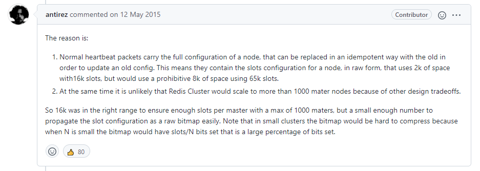 作者大意是说:在正常心跳包中就可以更新节点的完整配置信息。如果插槽的大小是16K个,心跳包大小只要2K;但是如果插槽有65K个,心跳包的大小就需要8K。另外,由于其他权衡设计,Redis集群的节点不太可能超过1K多。所以16K的插槽是在正确的范围内,以保证每个节点有足够的插槽。