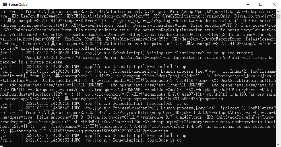 下载完成后解压,我的环境为windows10系统,双击bin\windows-x86-64\StartSonar.bat即可启动SonarQube,启动成功记录如下;