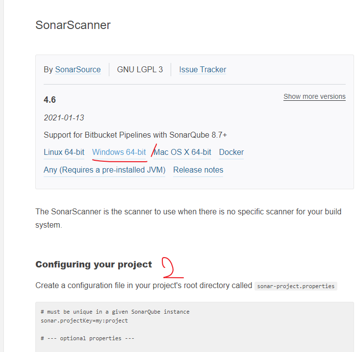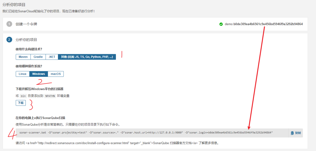 下载并配置扫描器,点击下载后会跳转到一个扫描器下载和配置说明页面,下载扫描器并根据配置说明,在您需要执行扫描的项目根目录新建sonar-project.properties配置文件,配置文件中的test为创建项目的名称。