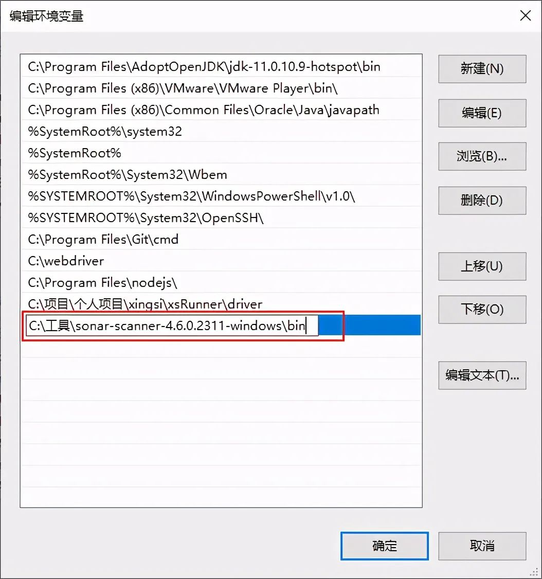 将扫描器添加到环境变量,如我添加到环境变量的路径为C:\工具\sonar-scanner-4.6.0.2311-windows\bin,根据您的解压路径进行调整