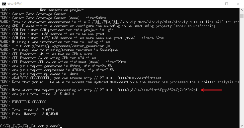 执行代码扫描,之前创建项目过程中已经生成了扫描器的执行命令,新打开一个cmd命令行窗口,cd到项目的根目录执行如下命令开始扫描,分析完成记录如下。
