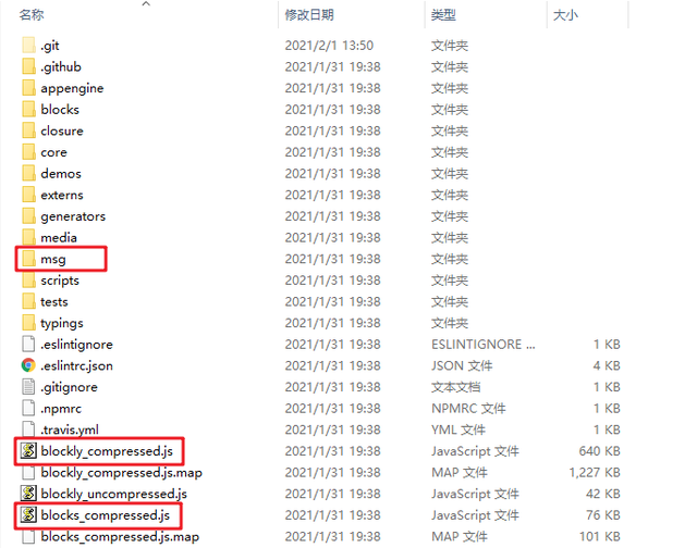 注:上手阶段只需关注图中红色标注的三个文件和目录,其中msg目录暂时只用到msg/js目录中的语言包,本文采用msg/js/zh-hans.js,表示为代码块使用的语言为中文。
