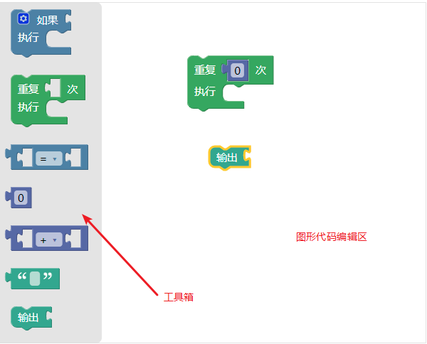 现在,通过浏览器打开index.html文件会显示一片空白,什么都不会发生,要使用blockly需要首先创建工作区,工作区是blockly的核心,下图就是一个典型的工作区的样子,由工具箱和图形代码编辑区两部分组成。