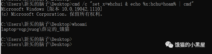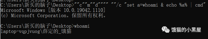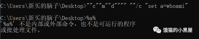 cmd ""/c "set m=whoami & echo %m% | cmd" # 可以执行