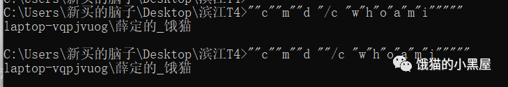 这里/k参数保留了当前的cmd环境 (可以通过窗口标题看出来, 环境并没有刷新), 因此可以成功执行。 根据以上演示的原理, 我分别尝试了使用/c和/k对混淆逻辑做了修改, 但是后面发现/k输出后没有回显, 还是得用/c。在这里卡了很久, 最后终于测出来是cmd /c之间的引号问题, 这里就很奇怪了, 因为在我们前面的演示中, cmd /c之间的引号是不会影响我们执行的。这里需要注意的是引号存在的位置, 我们可以看到在cmd和/c之间引号是不起作用的 (无论奇偶, 另外补充一下在使用^转义符号的时候, 会跟引号的奇偶数有关系)""c""m""d "/c "w"h"o"a"m"i"""""