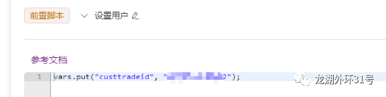 在请求体中使用${custtradeid}变量,用于在前置脚本或者场景化的时候赋值。之后添加对应的前置脚本“设置用户”,这里比较简单,就是一个普通的变量赋值。