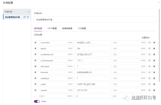 点击环境配置按钮,可以在弹出页配置此环境的 通用配置、Hosts、Http配置,数据库配置及TCP配置。