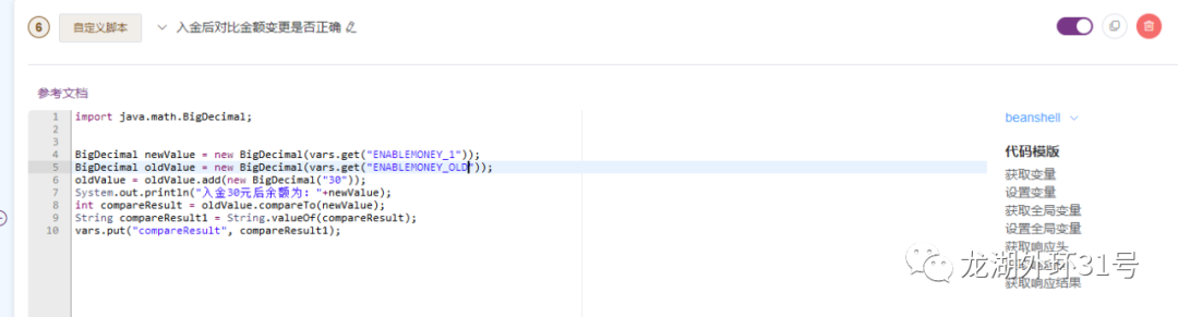 可以注意到,本场景使用自定义脚本+断言的方式实现了对业务规则的检查,具体操作为:首先使用beanshell获取前述步骤中重命名的变量名,及sql查询的变量名(后续文章将继续介绍相关套路),使用BigDecimal类型进行精确存储,并进行了计算,将对比结果保存为自定义变量compareResult,之后添加断言规则,对compareResult结果进行断言。
