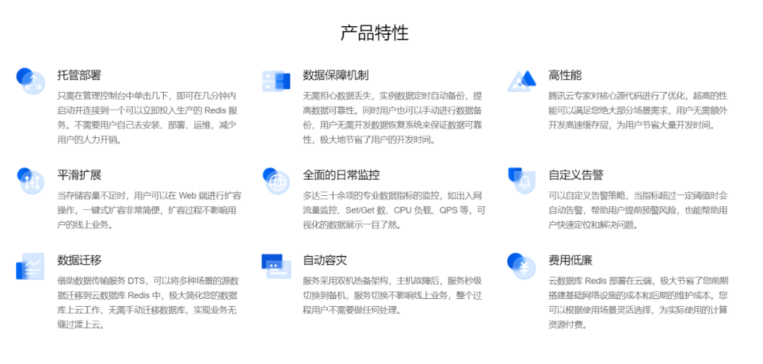 Redis支持主从热备,提供自动容灾切换、数据备份、故障迁移、实例监控、在线扩容、数据回档等全套的数据库服务。