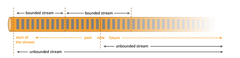 有界数据,就是在一个确定的时间范围内的数据流,有开始,有结束,一旦确定就不会再改变,一般 批处理 用来处理有界数据,如上图的 bounded stream。