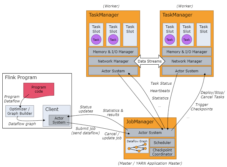 Flink 集群采取 Master - Slave 架构,Master的角色为 JobManager,负责集群和作业管理,Slave的角色是 TaskManager,负责执行计算任务,同时,Flink 提供客户端 Client 来管理集群和提交任务,JobManager 和 TaskManager 是集群的进程。