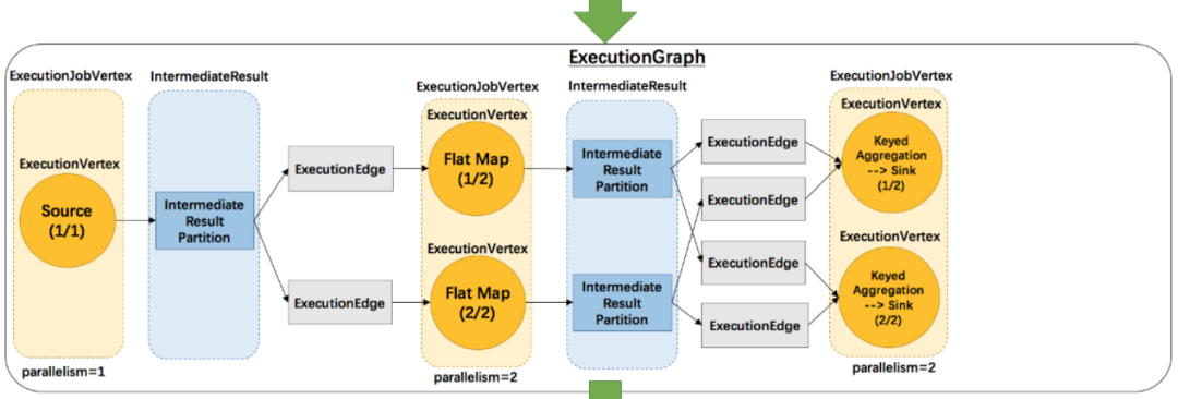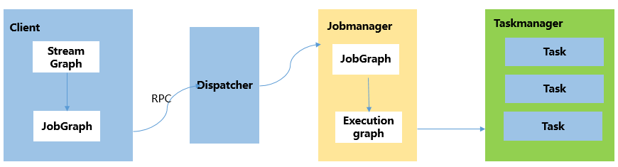 Flink 根据用户提交的代码生成 StreamGraph,经过优化生成 JobGraph,然后提交给 JobManager进行处理,JobManager 会根据 JobGraph 生成 ExecutionGraph,ExecutionGraph 是 Flink 调度最核心的数据结构,JobManager 根据 ExecutionGraph 对 Job 进行调度,根据物理执行图部署到Taskmanager上形成具体的Task执行。