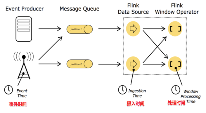 Flink 支持了流处理程序在时间上的三个定义:事件时间 EventTime、摄入时间 IngestionTime 、处理时间 ProcessingTime。同时也支持 watermark 机制来处理滞后数据。