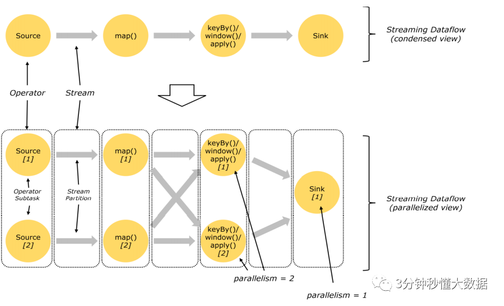一个Stream可以被分成多个Stream的分区,也就是Stream Partition。一个Operator也可以被分为多个Operator Subtask。如上图中,Source被分成Source1和Source2,它们分别为Source的Operator Subtask。每一个Operator Subtask都是在不同的线程当中独立执行的。一个Operator的并行度,就等于Operator Subtask的个数。