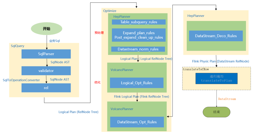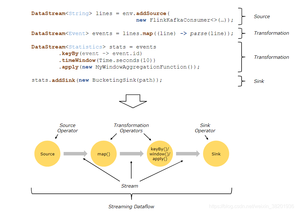 Flink程序在执行的时候,会被映射成一个Streaming Dataflow。一个Streaming Dataflow是由一组Stream和Transformation Operator组成的。在启动时从一个或多个Source Operator开始,结束于一个或多个Sink Operator。