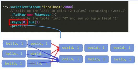 (2)Redistributing (重新分配)模式:这种模式会改变数据的分区数;每个operator subtask会根据选择transformation把数据发送到不同的目标subtasks,比如keyBy()会通过hashcode重新分区,broadcast()和rebalance()方法会随机重新分区;