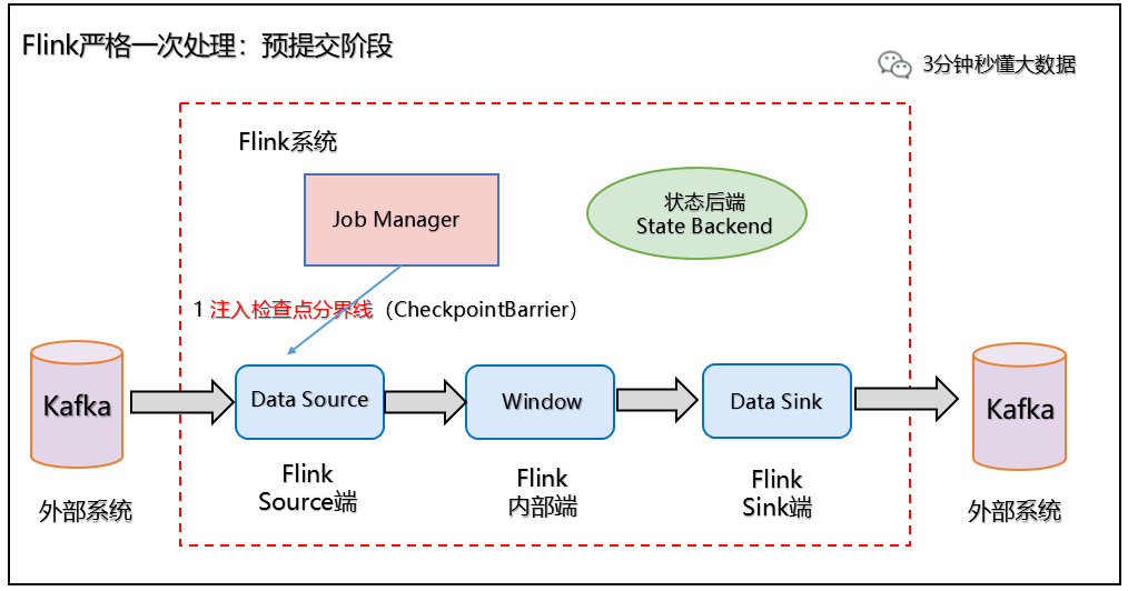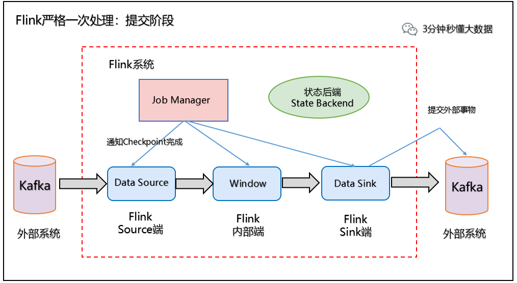 Flink 利用检查点特性,在框架层面 提供 Exactly-once 语义,即端到端的一致性,确保数据仅处理一次,不会重复也不会丢失,即使出现故障,也能保证数据只写一次。