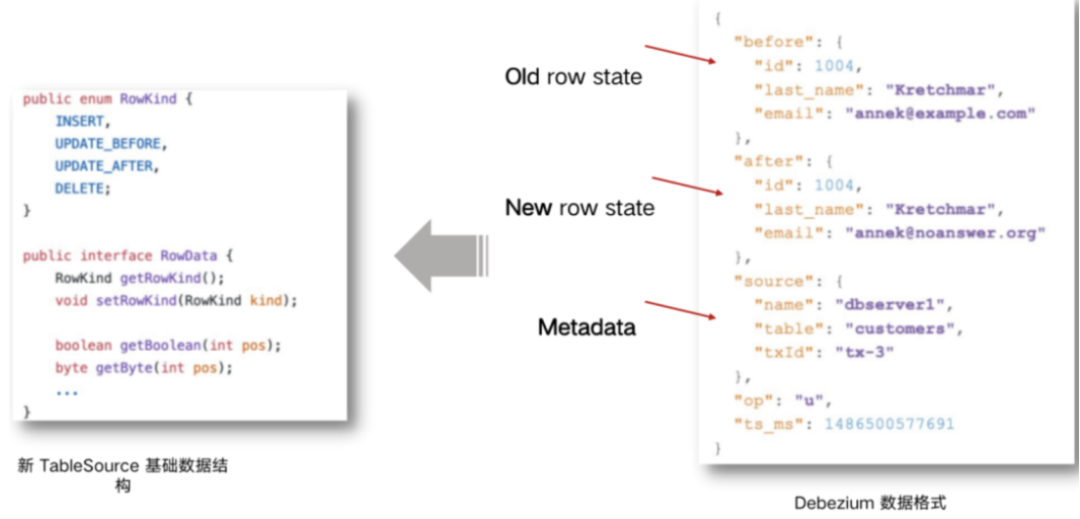 Flink SQL CDC 内置了 Debezium 引擎,利用其抽取日志获取变更的能力,将 changelog 转换为 Flink SQL 认识的 RowData 数据。(以下右侧是 Debezium 的数据格式,左侧是 Flink 的 RowData 数据格式)。
