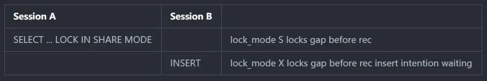 执行 select ... lock in share mode 语句,对要操作的页加 RW-S-LATCH,如果页面上存在 RW-X-LATCH 会被阻塞,没有的话则判断记录上是否存在活跃的事务,如果存在,则为 insert 事务创建一个排他记录锁,并将自己加入到锁等待队列,最后也会释放 RW-S-LATCH;