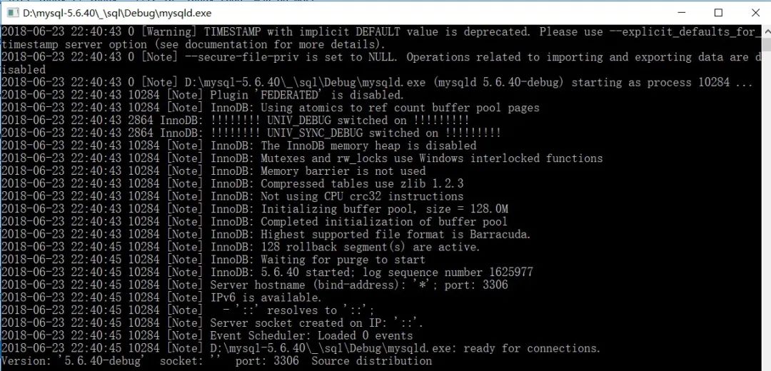 另外, client\Debug\mysql.exe 这个文件是对应的 MySQL 的客户端,可以直接双击运行,默认使用的用户为 ODBC@localhost,如果要以 root 用户登录,可以执行 mysql.exe -u root,不需要密码。
