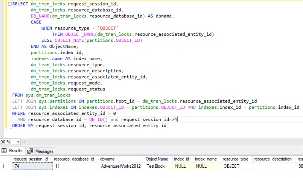 SELECT dm_tran_locks.request_session_id,dm_tran_locks.resource_database_id,DB_NAME(dm_tran_locks.resource_database_id) AS dbname,CASEWHEN resource_type = 'OBJECT'THEN OBJECT_NAME(dm_tran_locks.resource_associated_entity_id)ELSE OBJECT_NAME(partitions.OBJECT_ID)END AS ObjectName,partitions.index_id,indexes.name AS index_name,dm_tran_locks.resource_type,dm_tran_locks.resource_description,dm_tran_locks.resource_associated_entity_id,dm_tran_locks.request_mode,dm_tran_locks.request_statusFROM sys.dm_tran_locksLEFT JOIN sys.partitions ON partitions.hobt_id = dm_tran_locks.resource_associated_entity_idLEFT JOIN sys.indexes ON indexes.OBJECT_ID = partitions.OBJECT_ID AND indexes.index_id = partitions.index_idWHERE resource_associated_entity_id > 0AND resource_database_id = DB_ID()and request_session_id=74ORDER BY request_session_id, resource_associated_entity_id