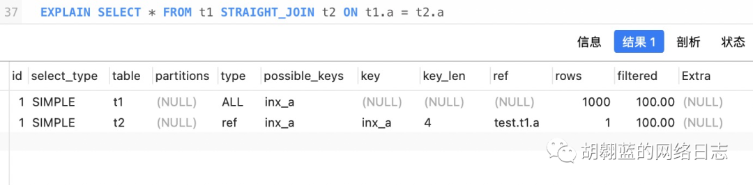 可以看到,表 t1 是驱动表,而且做了全表扫描,被驱动表 t2 的字段 a 上有索引,join 的过程中用上了这个索引,因此这条 SQL 的执行过程是: