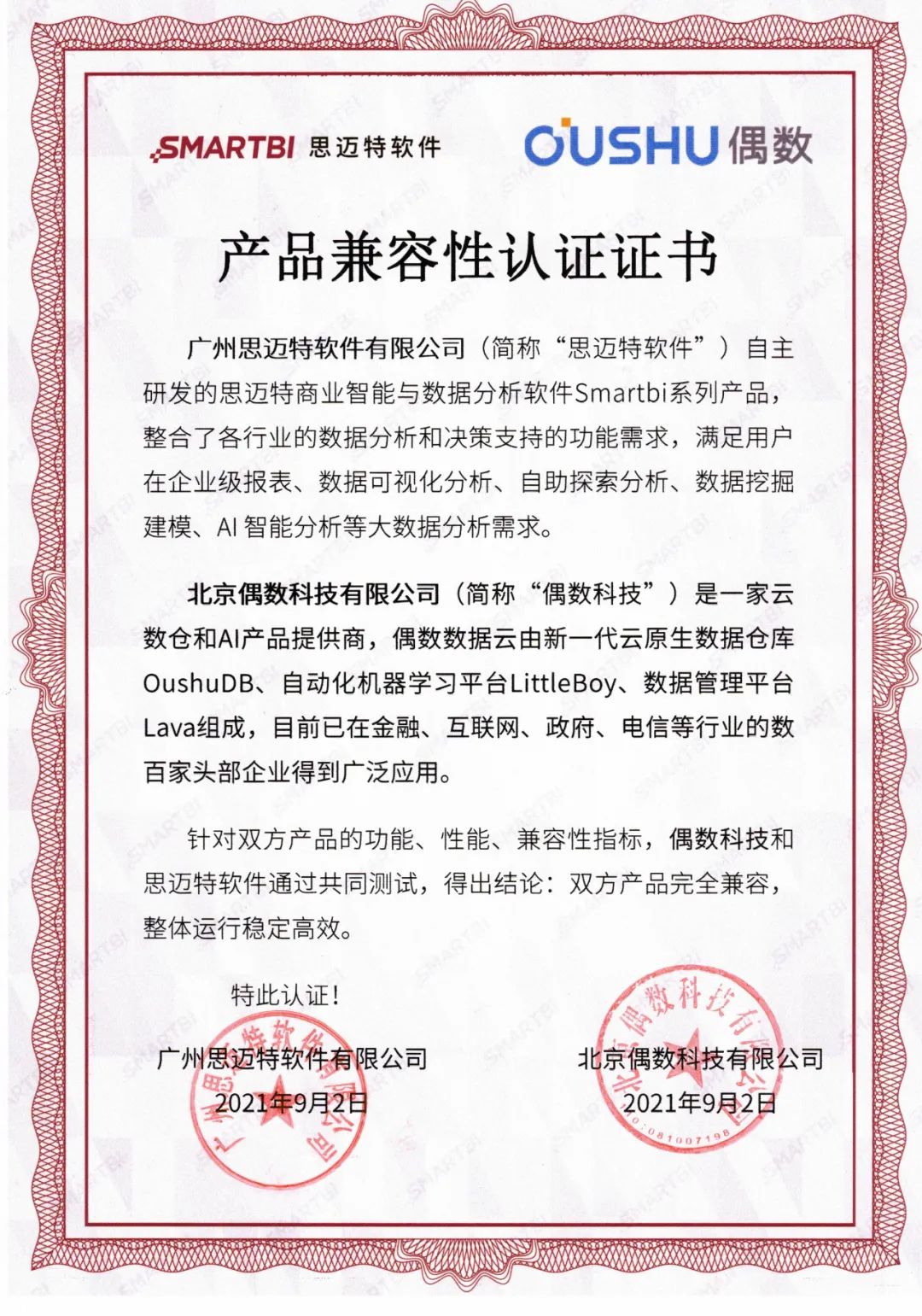 近日,北京偶数科技有限公司和思迈特有限公司针对双方产品的功能、性能和兼容性共同进行了严格测试,偶数「新一代云原生数据仓库OushuDB」与「思迈特商业智能与数据分析软件 Smartbi 系列产品」共同稳定运行,安全可靠,性能卓越,完全兼容。偶数数据云由新一代云原生数据仓库OushuDB、自动化机器学习平台 LittleBoy、数据管理平台Lava 组成,目前已在金融、互联网、政府、电信等行业的数百家头部企业得到广泛应用。广州思迈特软件有限公司自主研发的思迈特商业智能与数据分析软件 Smartbi 系列产品,整合了各行各业的数据分析和决策支持的功能需求,满足用户在企业级报表、数据可视化、自助探索分析、数据挖掘建模、AI 智能分析等大数据分析需求。偶数的高性能云数据仓库和机器学习平台,搭配 Smartbi 专业的数据分析和决策能力,将给行业客户带来性能更好、体验更佳、更为智能的数字化建设选型方案。此次互认准是两家企业朝着完善发展国产基础软件生态系统的一大步迈进。本次合作势必推动双方产品在国产生态建设领域得到进一步发展。未来,偶数科技亦会继续坚定初心,携手更多的业内外优质企业、合作伙伴,共同推进我国国产基础软件生态建设的高速发展,为各行业用户提供优质、安全、稳定的数据库产品,促进我国信息产业高质量发展。