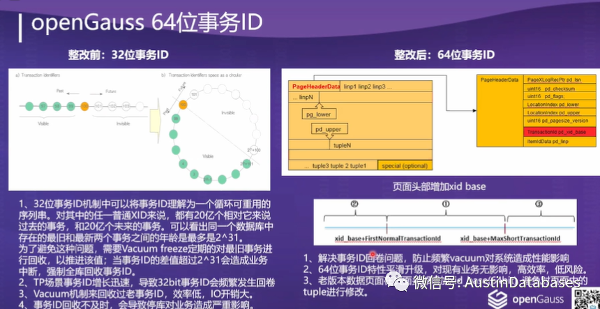 5 针对PG的 32位的TXID ,转变为64位,将高并发系统中存在的频繁VACUUM 使性能不高的问题化解,同时降低了系统在管理不善中容易触发的"冷冻时间"从根源解决。