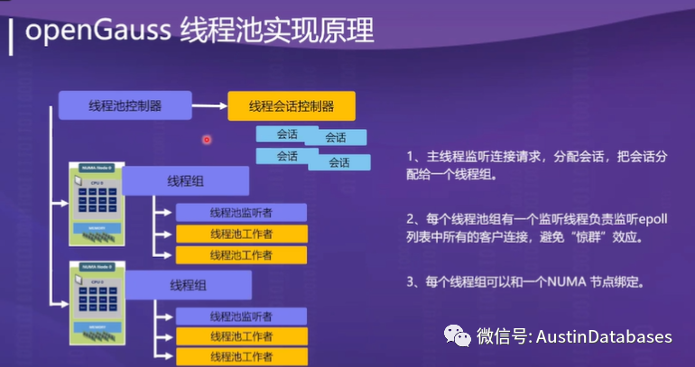 4 OpenGauss 自己制作了线程池,主要的原因是避免了高并发中连接的无效争抢资源,提高了高并发中对CPU的有序利用,有序的调度并行的任务,避免系统资源不足的情况下,对系统资源的无效使用。(这点个人认为是很重要的,也是PG本身的缺陷所在之一)