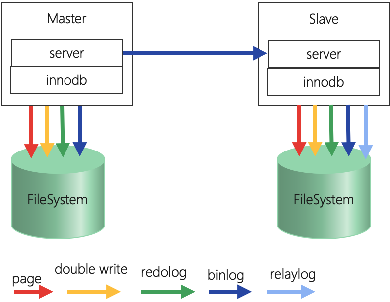如上图所示,除了页写入与 double write,redo log 写入操作外,还有 binlog 与 relay log 的写入。