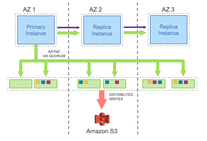 它采用 3 个可用区,可以形成 4/6 仲裁协议(6 个节点,写需 4 个投票,读需 3 个投票)。最坏情况是某个可用区出现灾害(地震,水灾,恐怖袭击等)时,同时随机出现一个节点故障,此时仍然有 3 个副本,可以使用 2/3 仲裁协议(3 个节点,写需 2 个投票,读需 2 个投票)继续保持高可用性(AZ+1 高可用)。