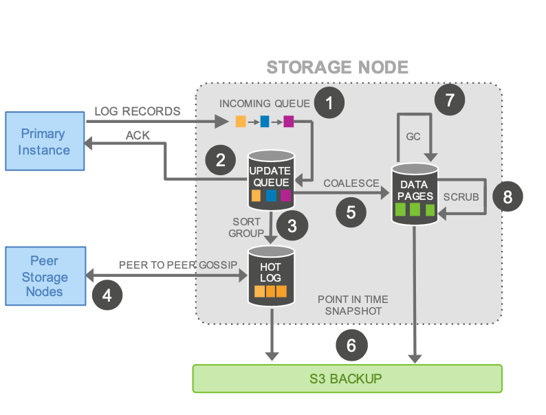 将存储分段(Segment),以 10G 作为分段单位大小, 每个分段共六个副本,部署于三个可用区(Available Zone),每个可用区两个副本,Aurora 将这六个分段称为一个保护组(Protection Group,PG),实现高可用。 存储节点能接收日志记录应用来实现数据库物理页的持久化,并且使用 Gossip 协议同步各个副本间的日志。