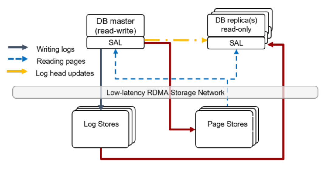 数据库主实例变成计算节点,数据库主实例不再进行刷脏页动作,仅仅向存储写日志,存储应用日志实现持久化,即日志应用下沉到存储。数据库主实例没有后台写动作,没有 cache 强制刷脏替换,没有检查点; 数据库复制实例获取日志内容,通过日志应用更新自身的 buffer/cache 等内存对象; 主实例与复制实例共享存储; 将崩溃恢复,备份、恢复、快照功能下放到存储层。
