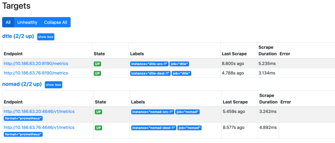 shell> cat /path/to/prometheus.ymlglobal: scrape_interval: 15s # Set the scrape interval to every 15 seconds. Default is every 1 minute. evaluation_interval: 15s # Evaluate rules every 15 seconds. The default is every 1 minute.scrape_configs: - job_name: 'nomad' scrape_interval: 15s metrics_path: '/v1/metrics' params: format: ['prometheus'] static_configs: - targets: ['10.186.63.20:4646'] labels: instance: nomad-src-1 - targets: ['10.186.63.76:4646'] labels: instance: nomad-dest-1 - job_name: 'dtle' scrape_interval: 15s metrics_path: '/metrics' static_configs: - targets: ['10.186.63.20:8190'] labels: instance: dtle-src-1 - targets: ['10.186.63.76:8190'] labels: instance: dtle-dest-1