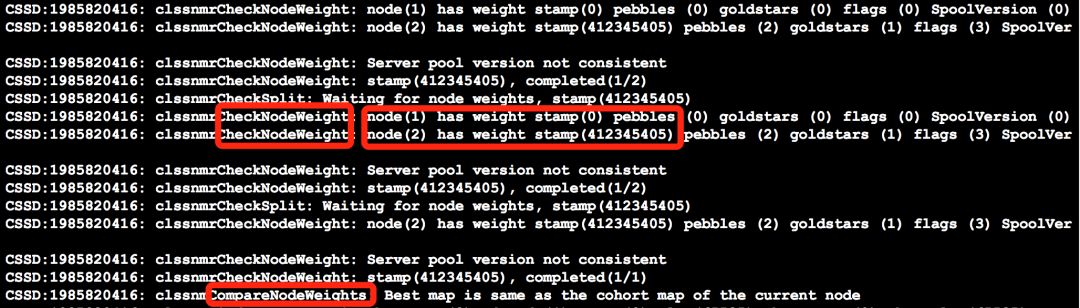 从上述信息来看,CSSD进程会去检查节点的权重情况(CheckNodeWeight)以及比较节点的权重(CompareNodeWeights)节点2的权重大,此时,节点2这个子群战胜了节点1子群,因而我们看到的情况是节点1被集群驱逐。