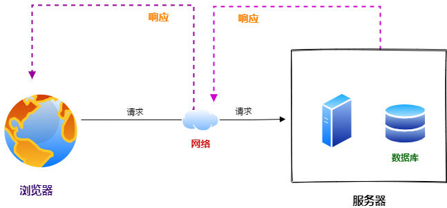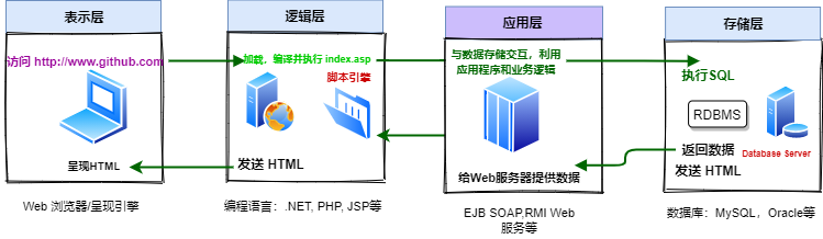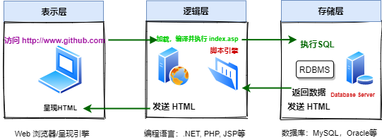 web浏览器(表示层)向中间层(逻辑层)发送请求,中间层通过查询、更新数据库(存储层)响应该请求:
