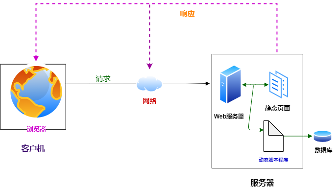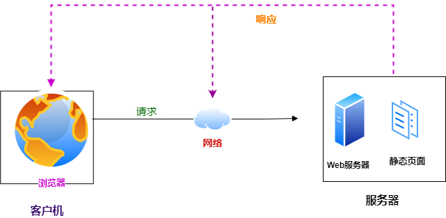 Web程序分为两种,即静态网页和动态网页。早期的是静态网页,HTML语言来写,放在Web服务器上,通过HTTP协议请求Server的Web页面,Web服务器接收到的用户请求处理后,在发送给客户端浏览器,显示给用户: